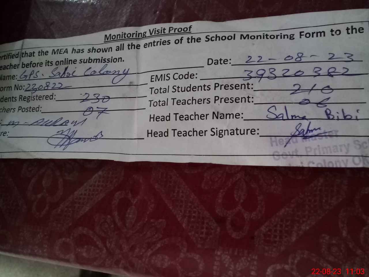 | Attendance Register | Head Teacher | MEA with School | Visit Proof |