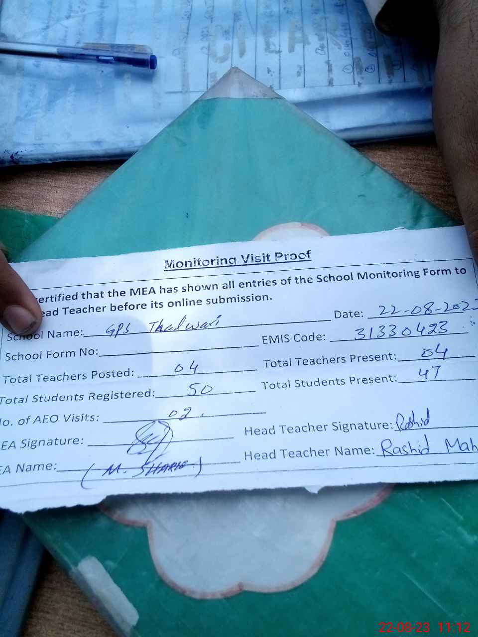 | Attendance Register | Head Teacher | MEA with School | Visit Proof |