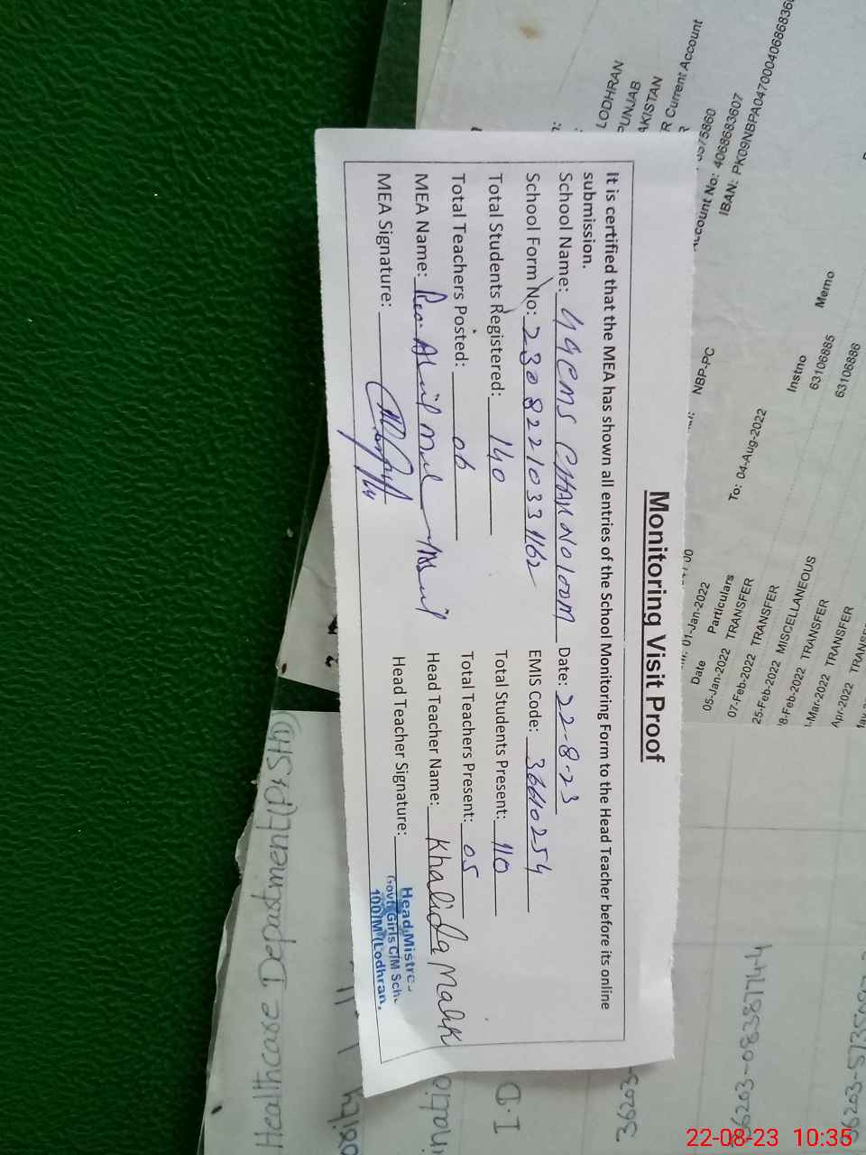| Attendance Register | Head Teacher | MEA with School | Visit Proof |