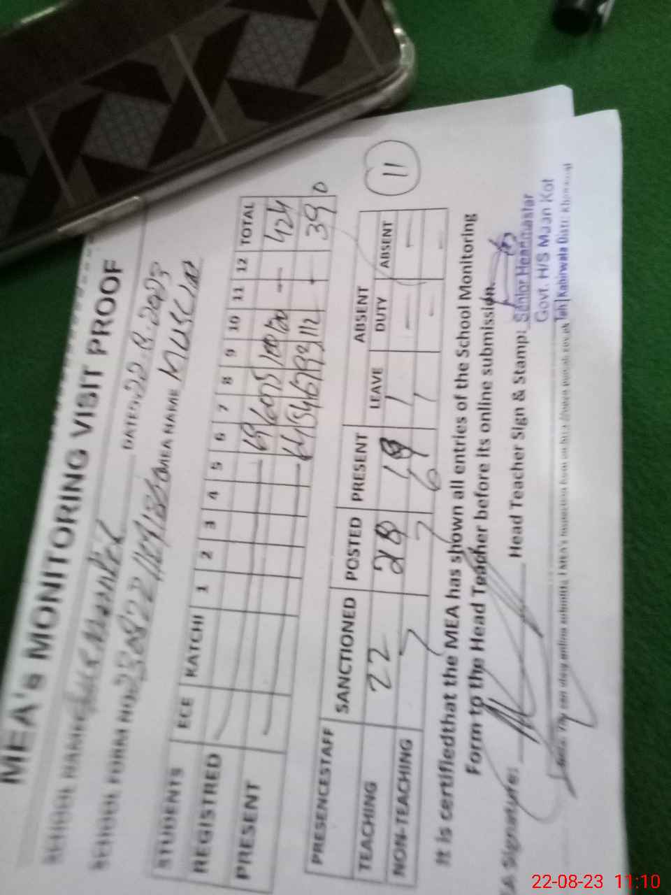 | Attendance Register | Head Teacher | MEA with School | Visit Proof |
