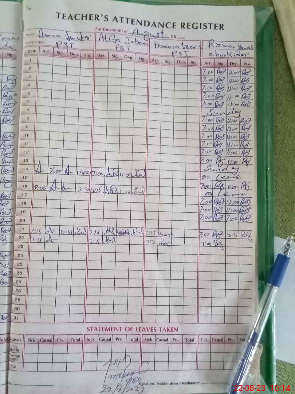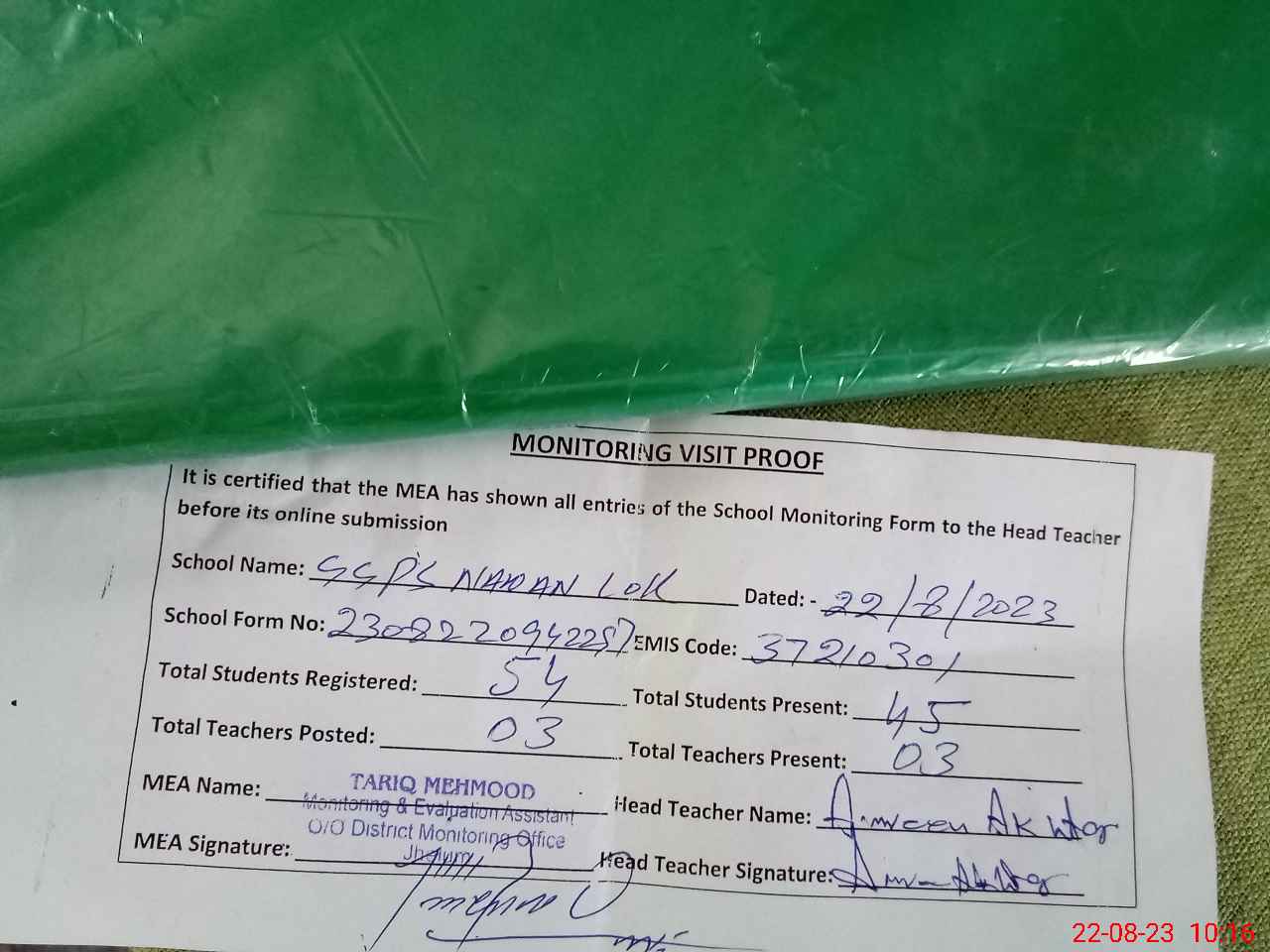 | Attendance Register | Head Teacher | MEA with School | Visit Proof |