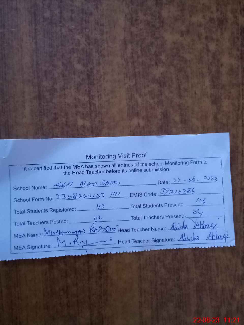 | EMIS Code: 39210386 | Name of School: GGPS ALAM DUHDI | |||