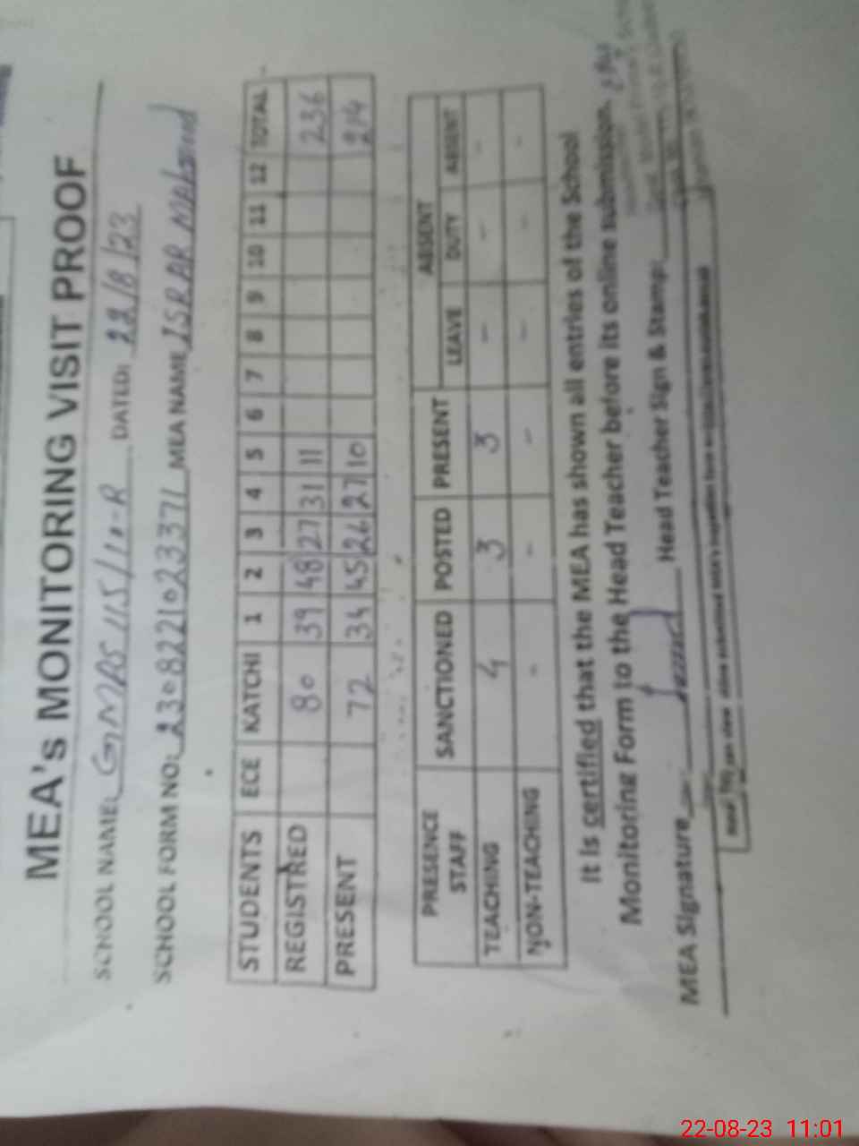 | Attendance Register | Head Teacher | MEA with School | Visit Proof |