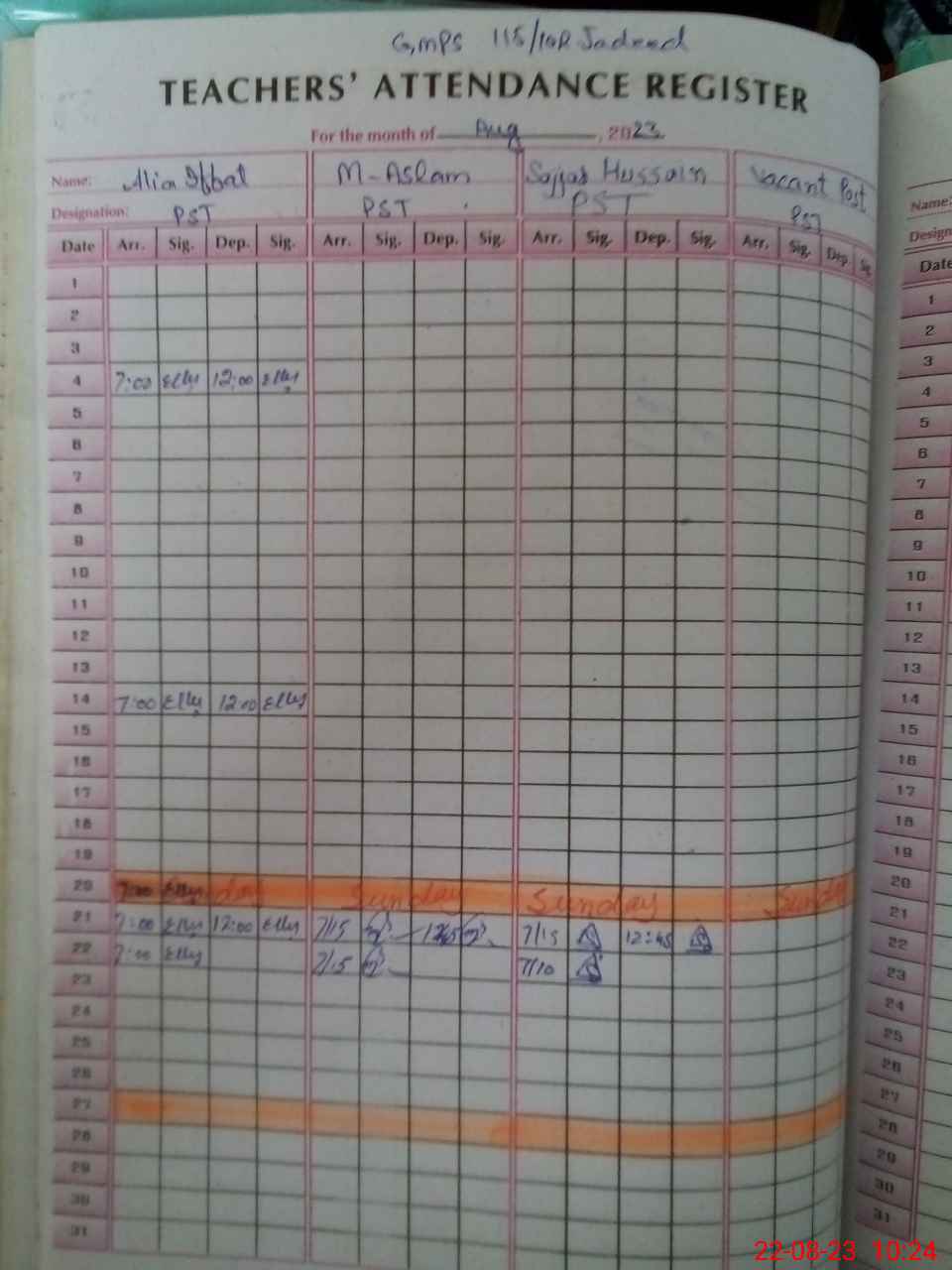 | CNIC | Full Name | Designation | R/C | Absence During Last Calender Month |