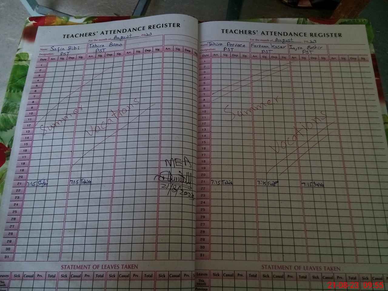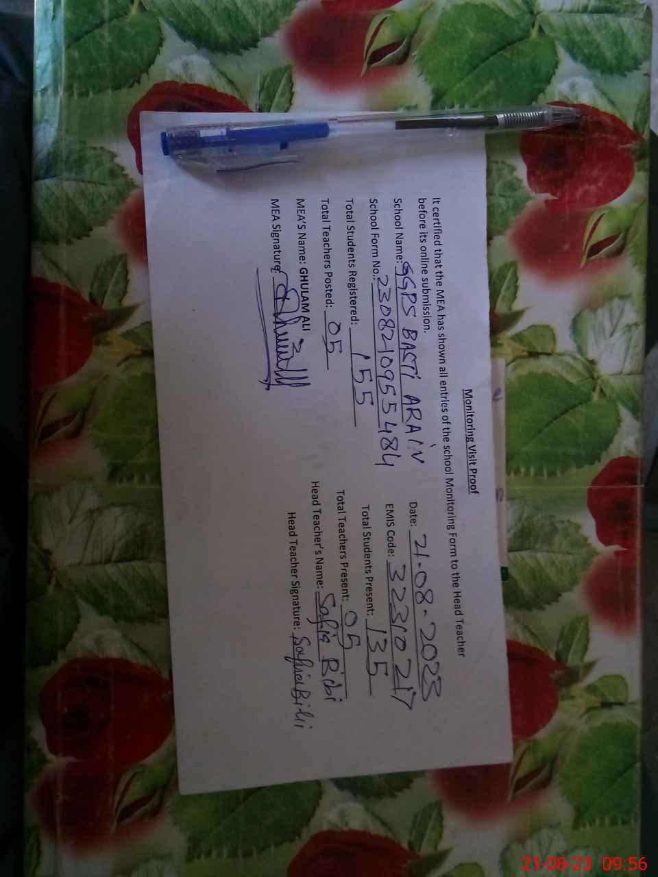 | Attendance Register | Head Teacher | MEA with School | Visit Proof |