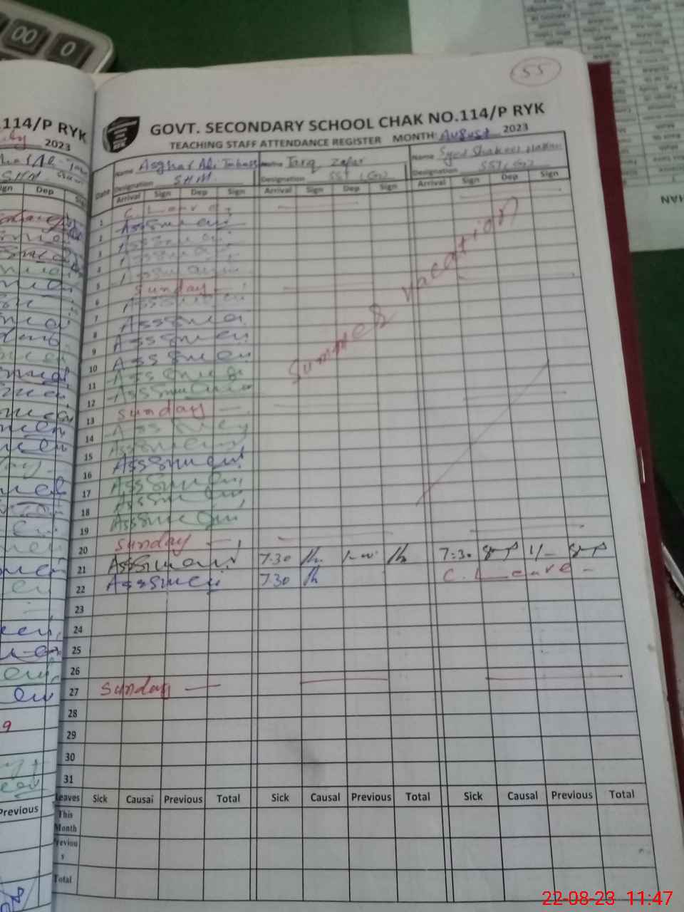 | CNIC | Full Name | Designation | R/C | Absence during last cal. month |