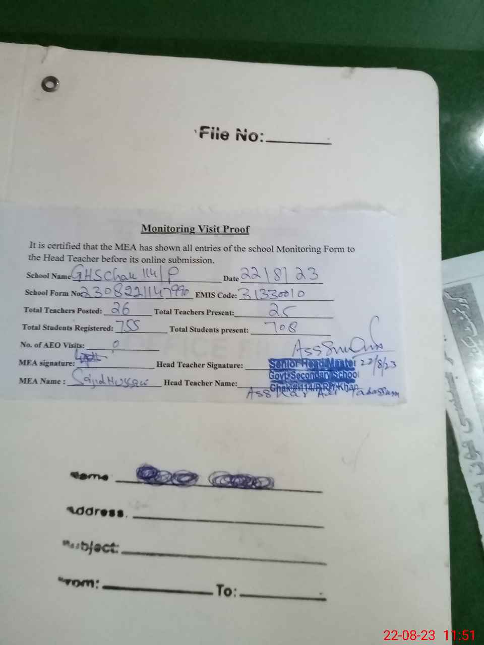| Attendance Register | Head Teacher | MEA with School | Visit Proof |