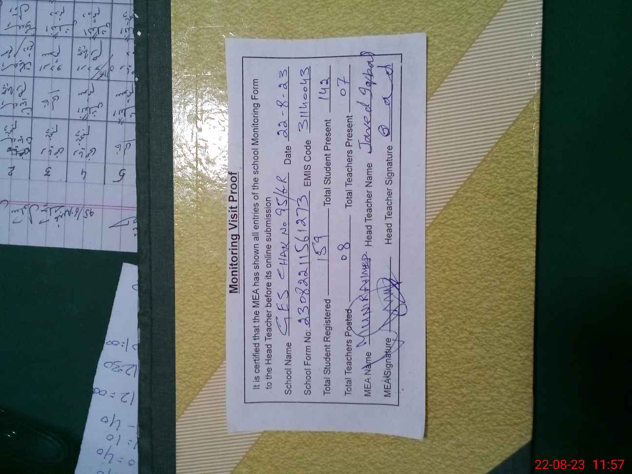 | Attendance Register | Head Teacher | MEA with School | Visit Proof |