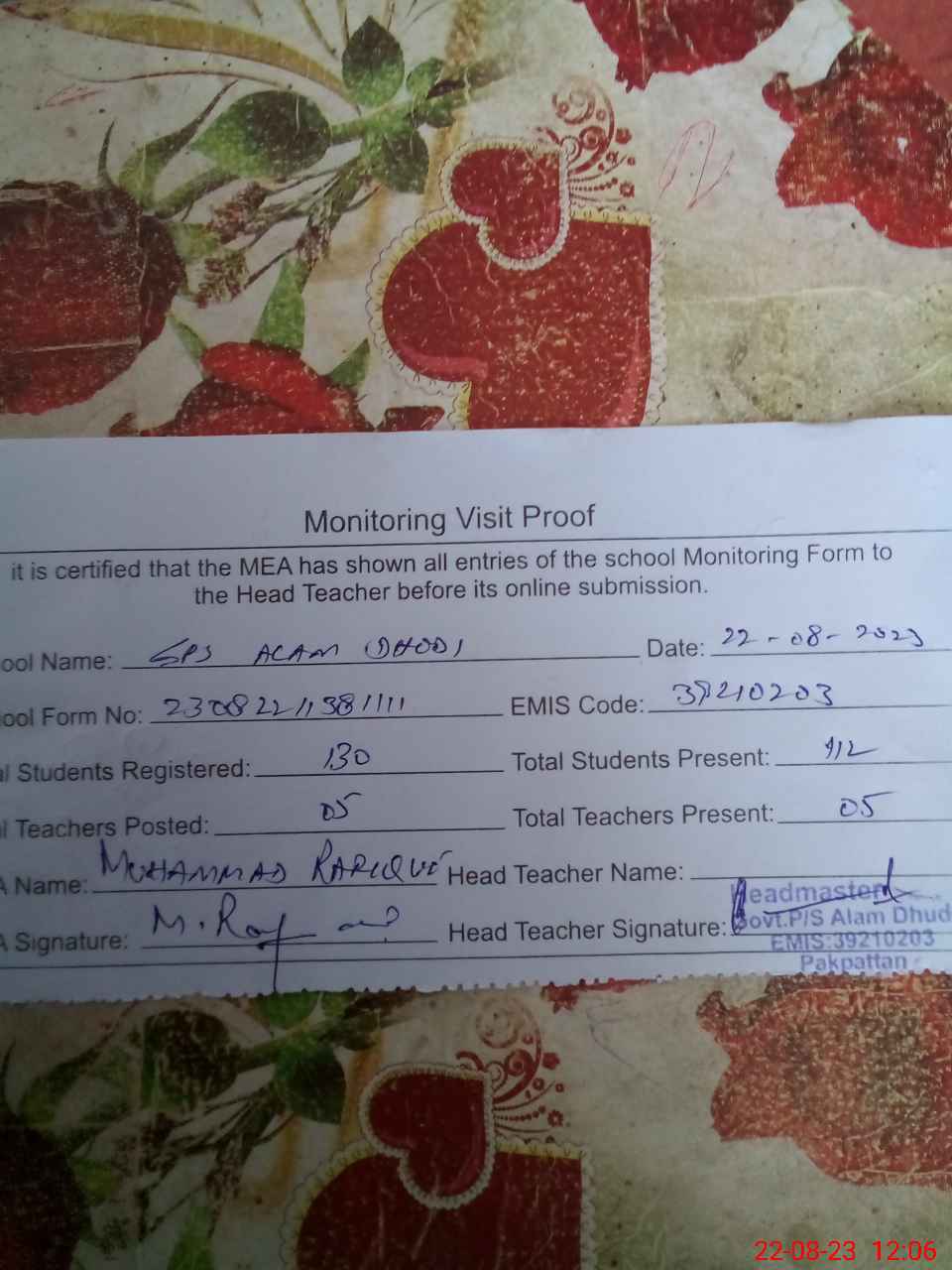 | Attendance Register | Head Teacher | MEA with School | Visit Proof |