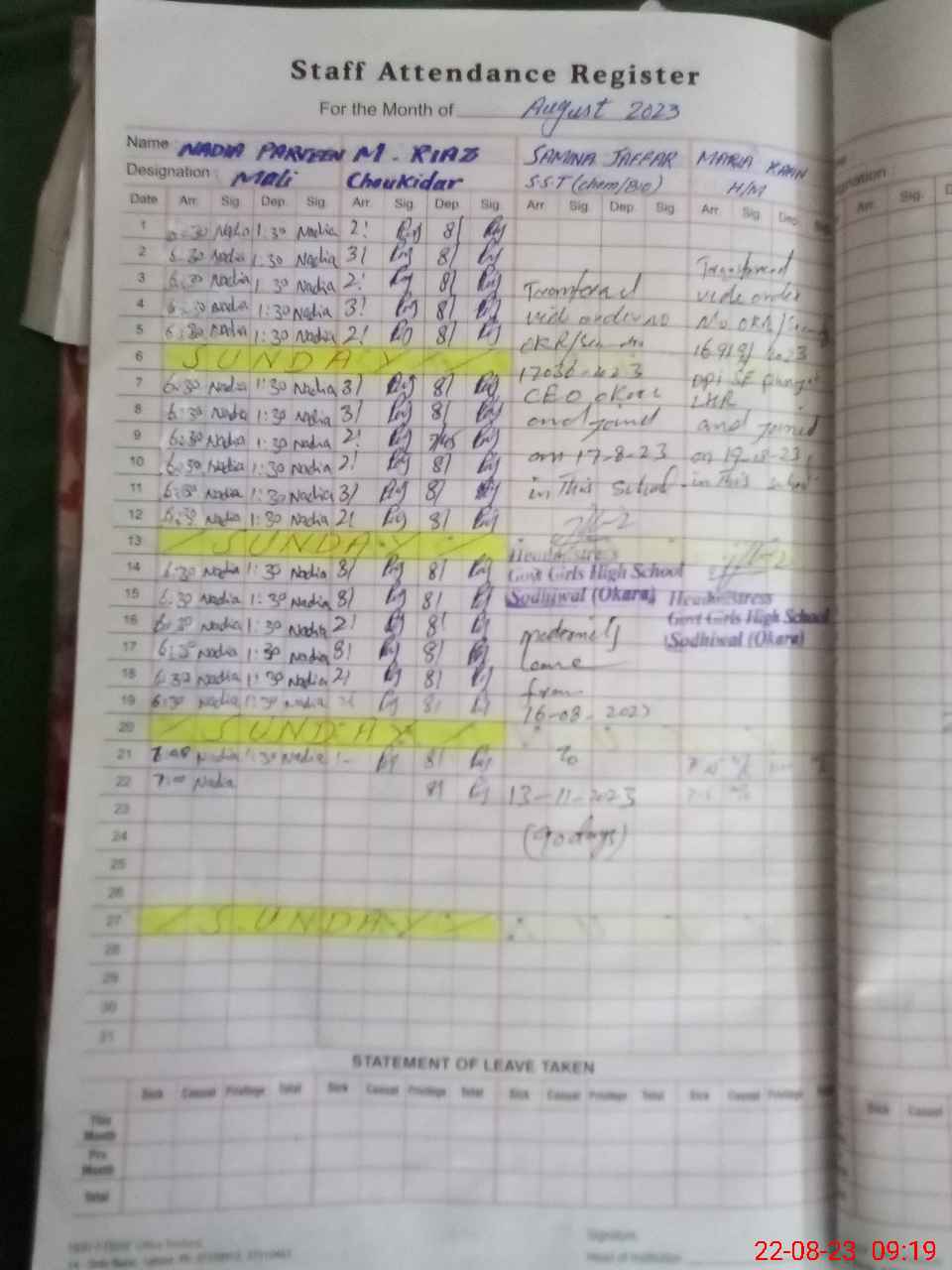 | Name: Za**** unNi**** Designation: (School Headmaster's/Headmistress's) HEADMISTRESS Phone/Cell Number: 03**** |
