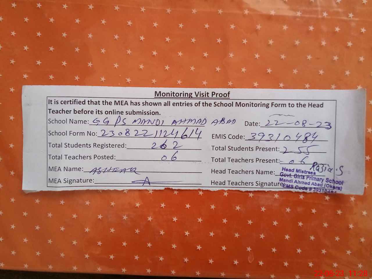 | EMIS Code: 39310484 | Name of School: GGPS MANDI AHMED ABAD | |||