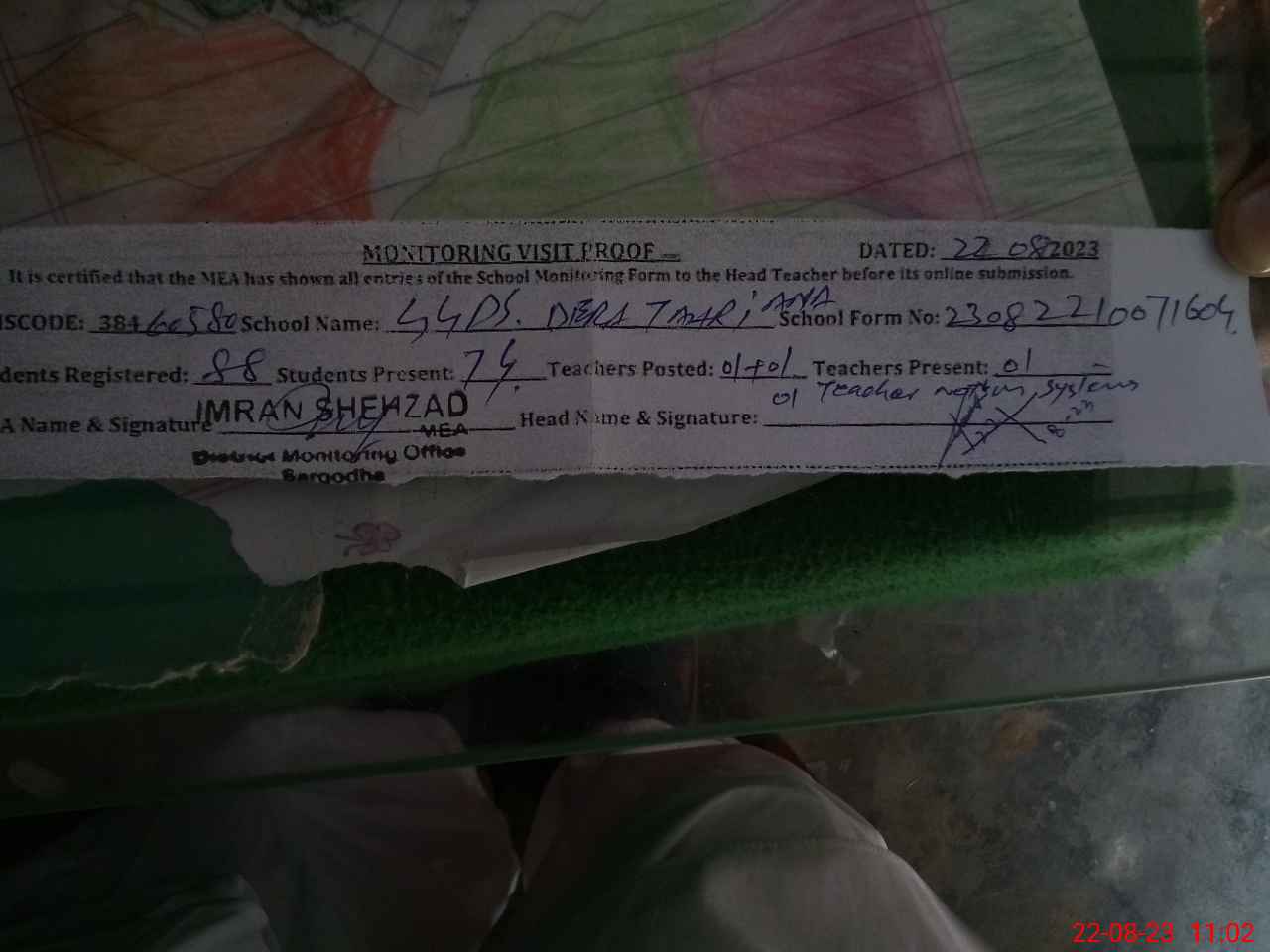 | Monitoring Date: 22-08-2023 | Start Time: 22-08-2023 10:07 AM | End Time: 22-08-2023 11:02 AM | Name of MEA: IM**** SH**** | |