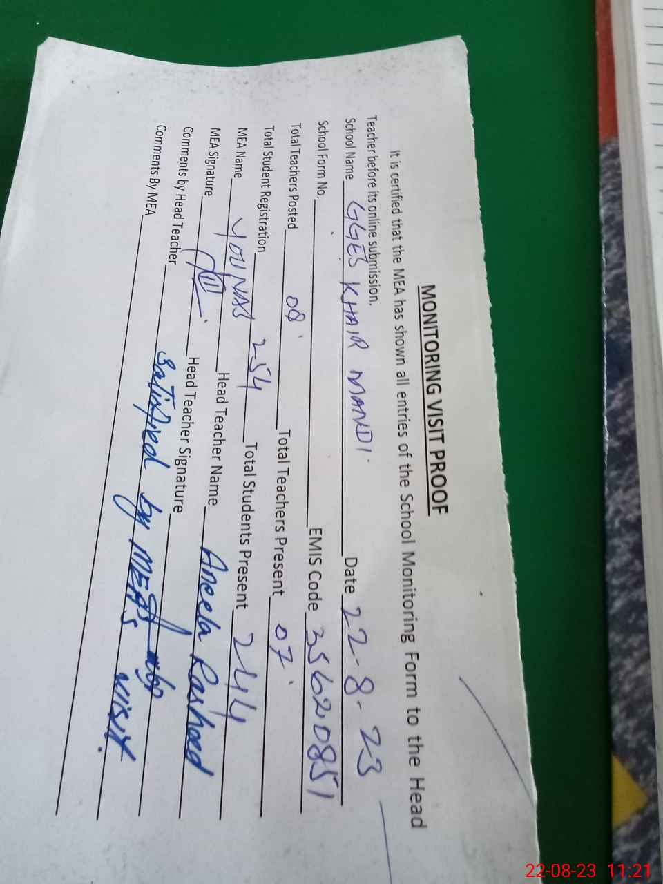 | Attendance Register | Head Teacher | MEA with School | Visit Proof |