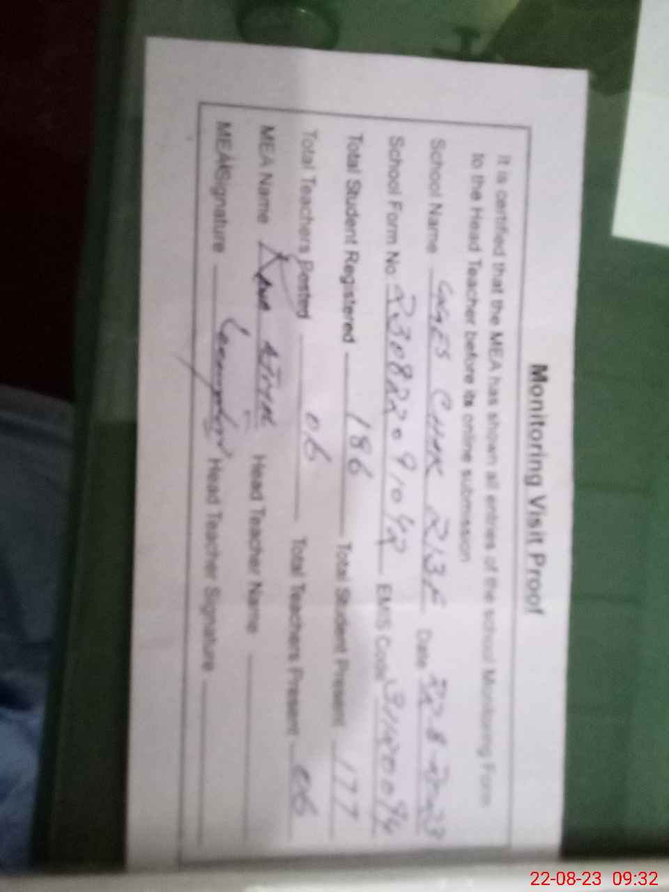 | Attendance Register | Head Teacher | MEA with School | Visit Proof |