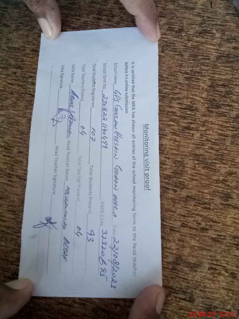 | Attendance Register | Head Teacher | MEA with School | Visit Proof |