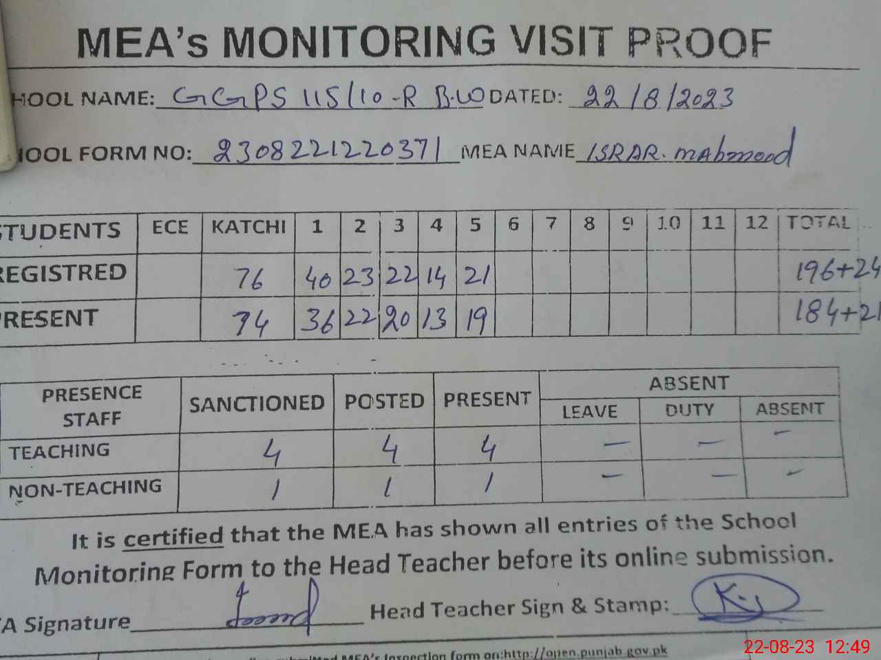 | Attendance Register | Head Teacher | MEA with School | Visit Proof |