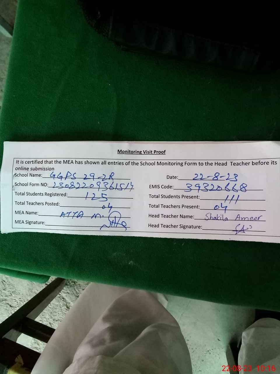 | Attendance Register | Head Teacher | MEA with School | Visit Proof |