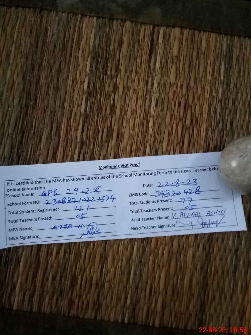| Attendance Register | Head Teacher | MEA with School | Visit Proof |