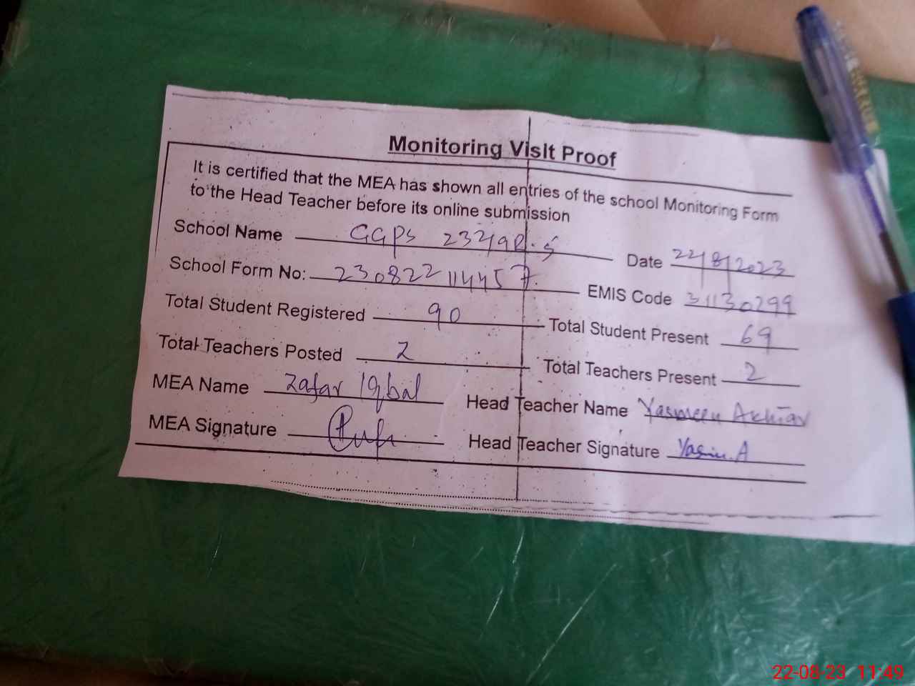 | Attendance Register | Head Teacher | MEA with School | Visit Proof |