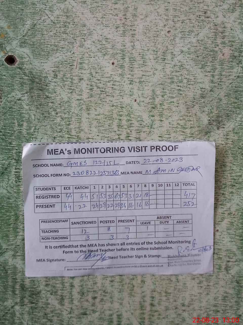 | Attendance Register | Head Teacher | MEA with School | Visit Proof |