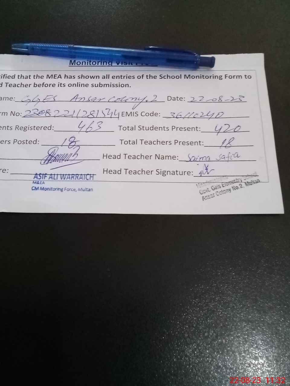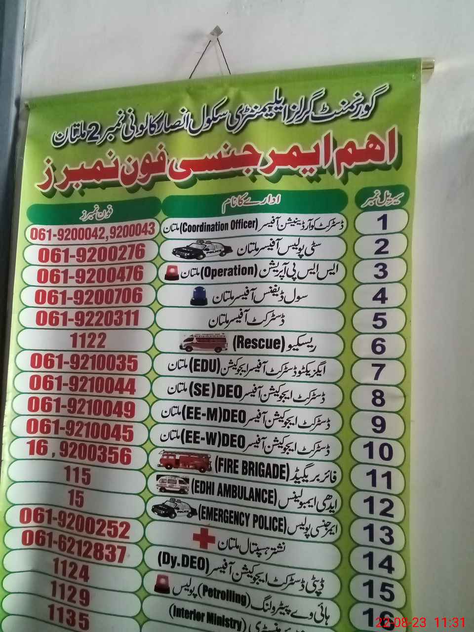 | EMIS Code: 36110240 | Name of School: GGES ANSAR COLONY NO. 2 MULTAN CITY | |||