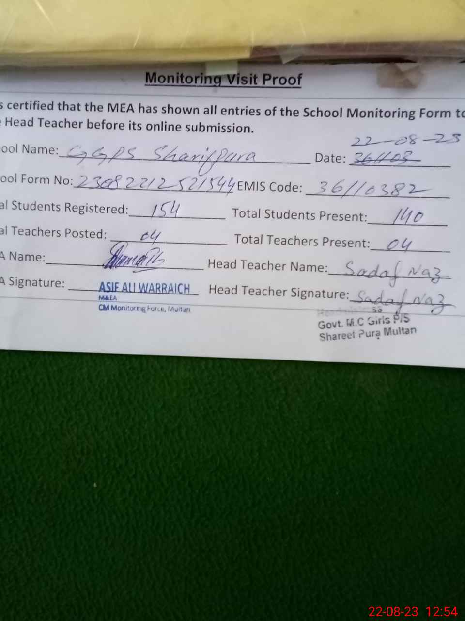 | Attendance Register | Head Teacher | MEA with School | Visit Proof |