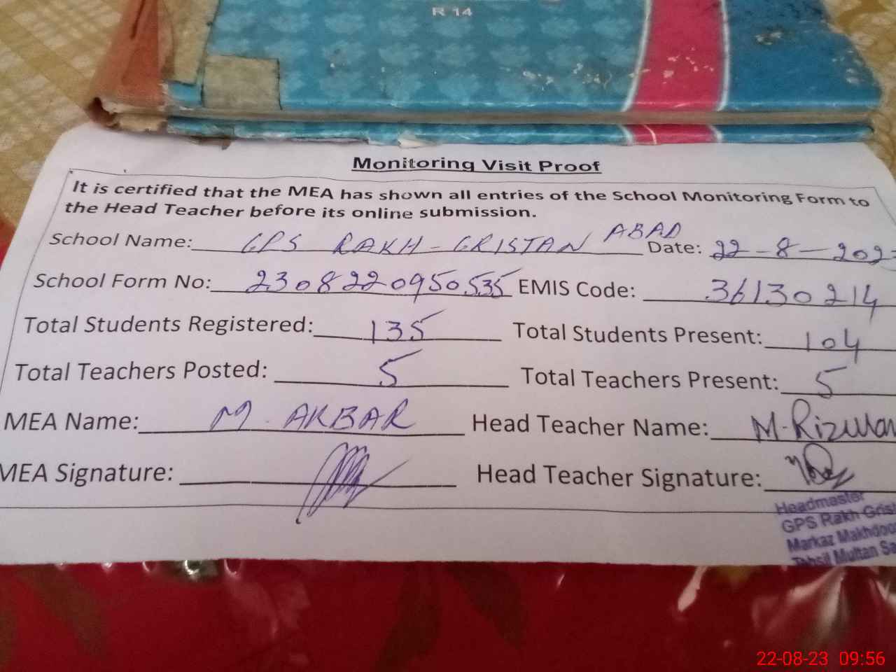 | EMIS Code: 36130214 | Name of School: GPS RAKH GRISTAN ABAD MAKHDUM RASHEED MULTAN | |||
