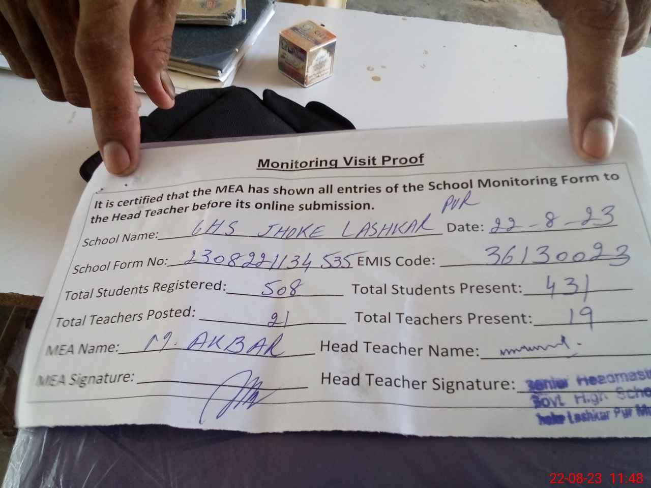 | Attendance Register | Head Teacher | MEA with School | Visit Proof |