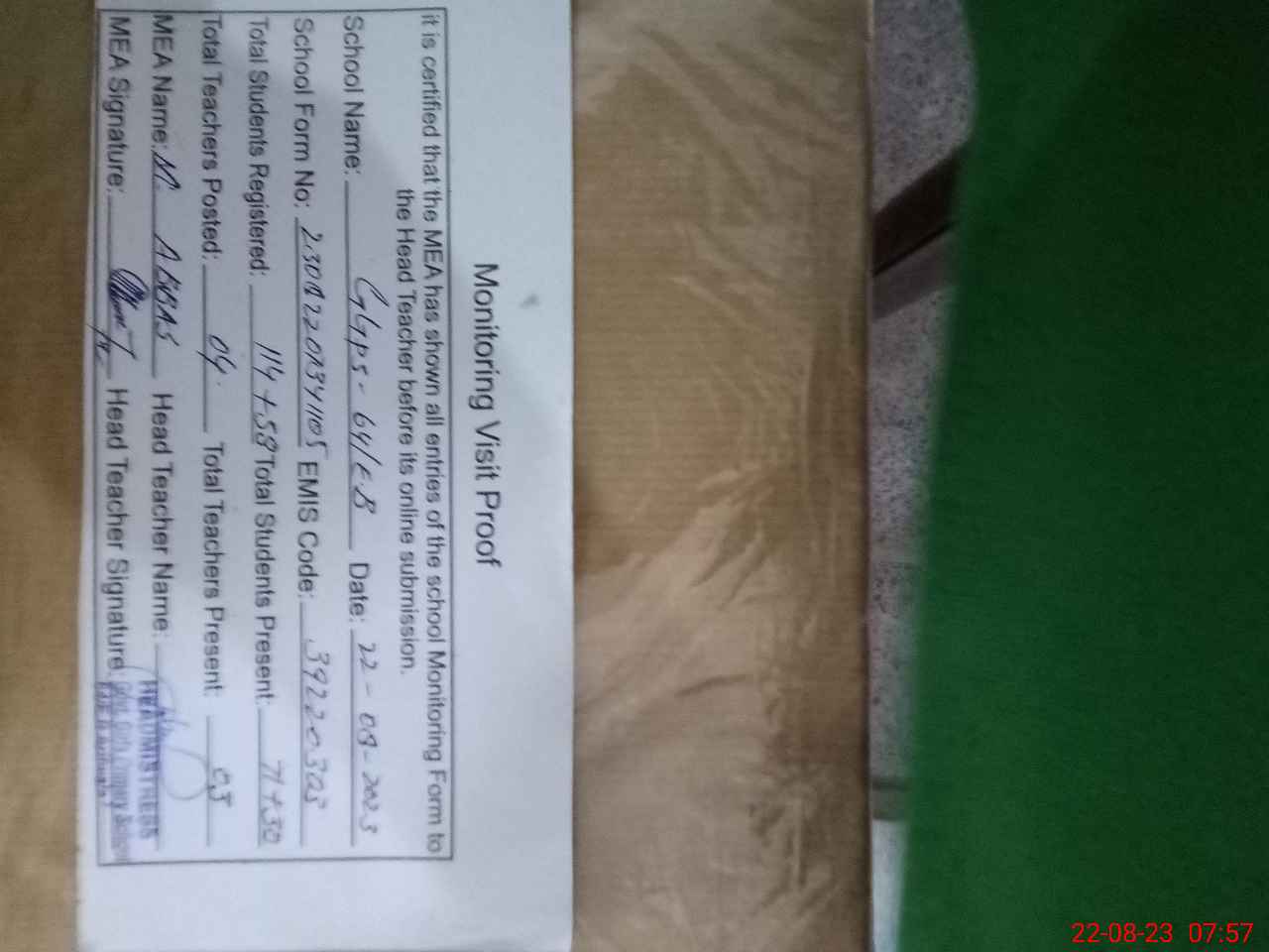 | Attendance Register | Head Teacher | MEA with School | Visit Proof |