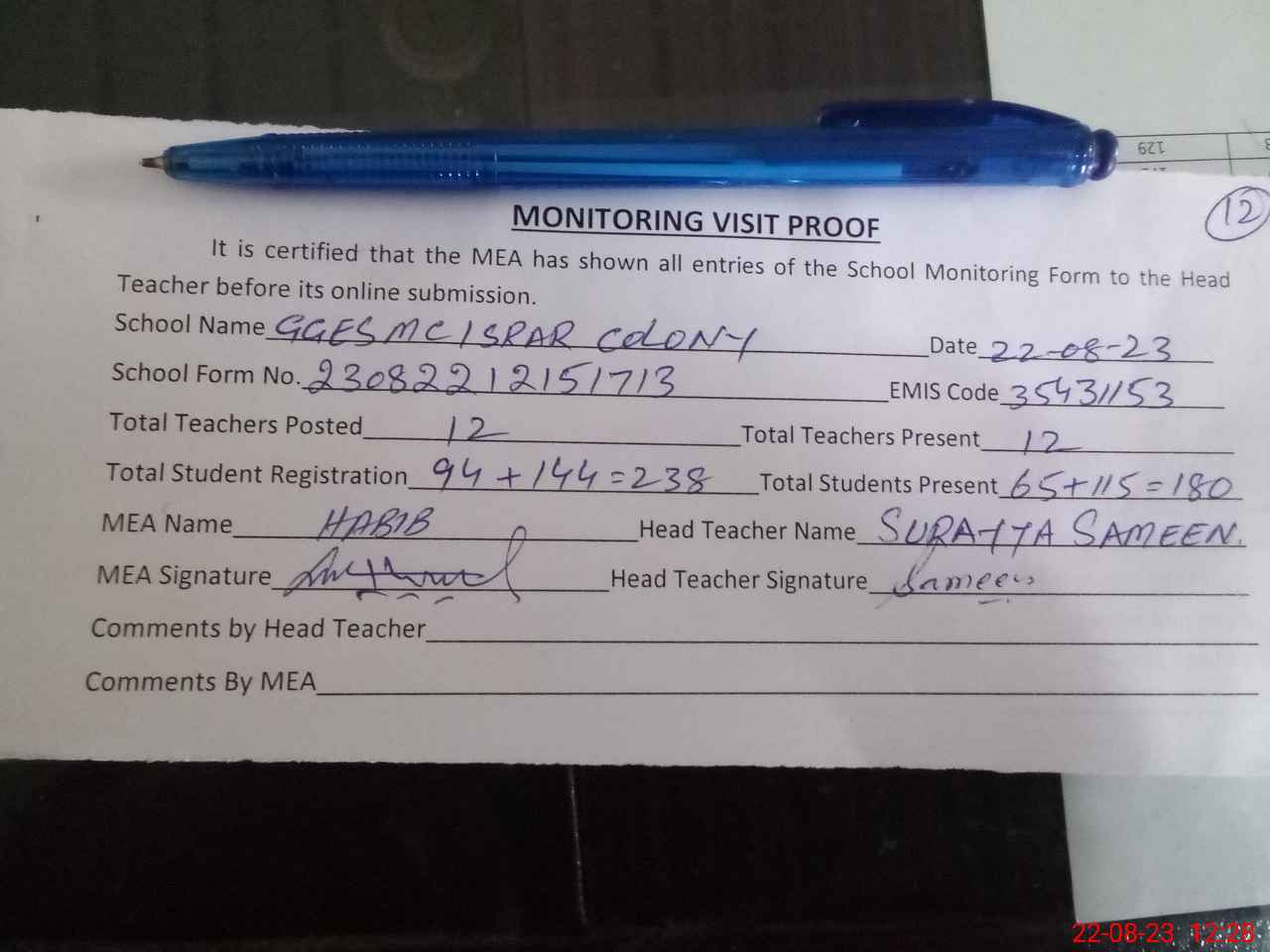 | Attendance Register | Head Teacher | MEA with School | Visit Proof |