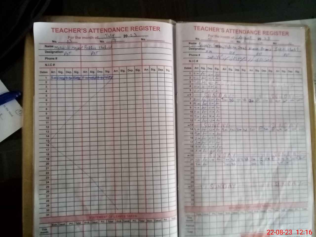 | CNIC | Full Name | Designation | R/C | Absence During Last Calender Month |