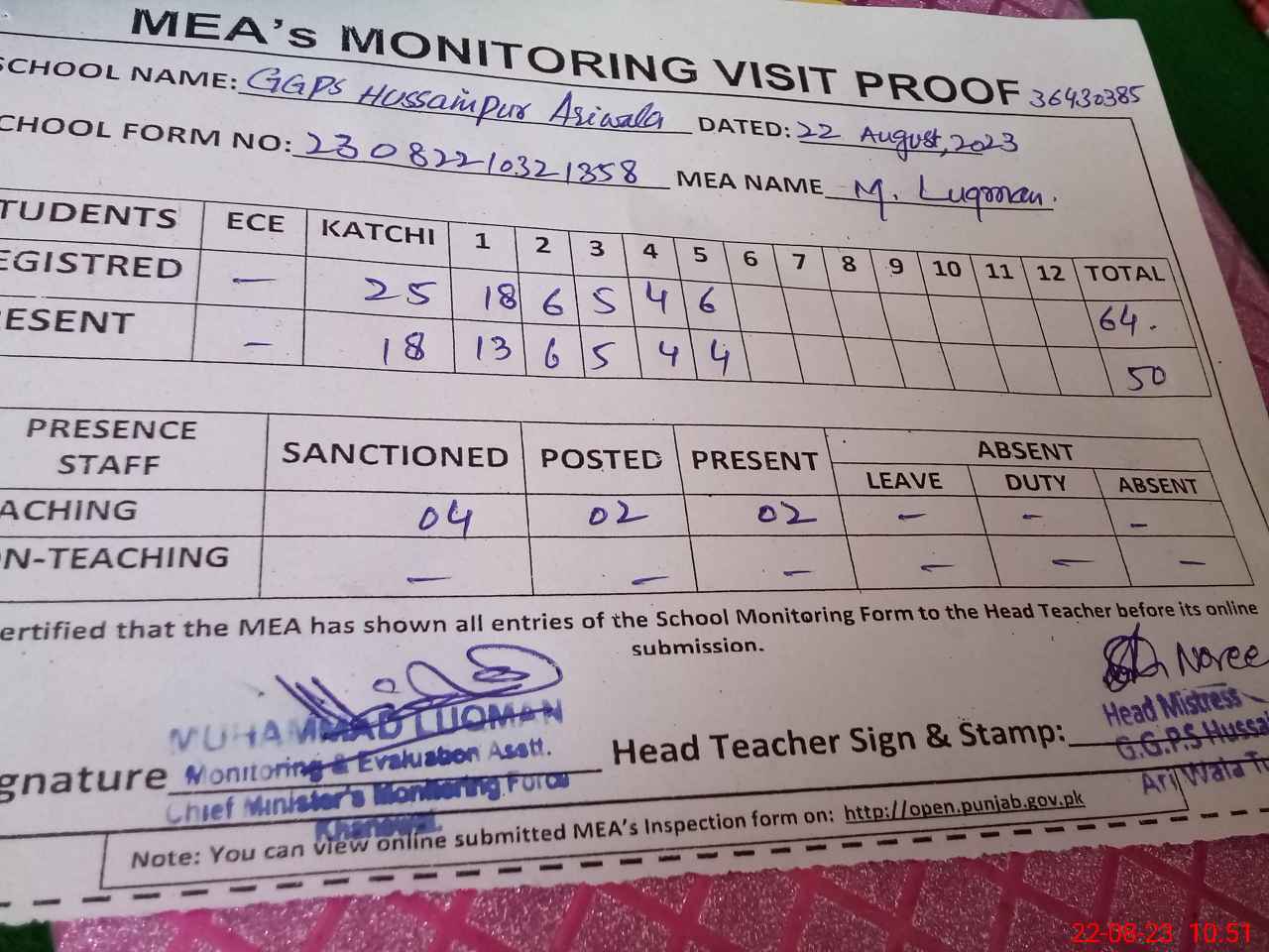 | EMIS Code: 36430385 | Name of School: GGPS HUSSAIN PUR ARI WALA, TULAMBA | |||