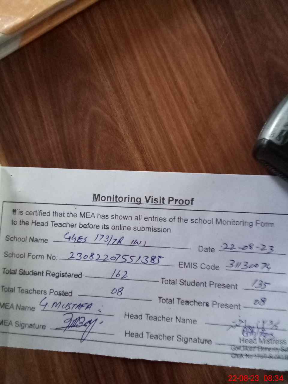 | Attendance Register | Head Teacher | MEA with School | Visit Proof |