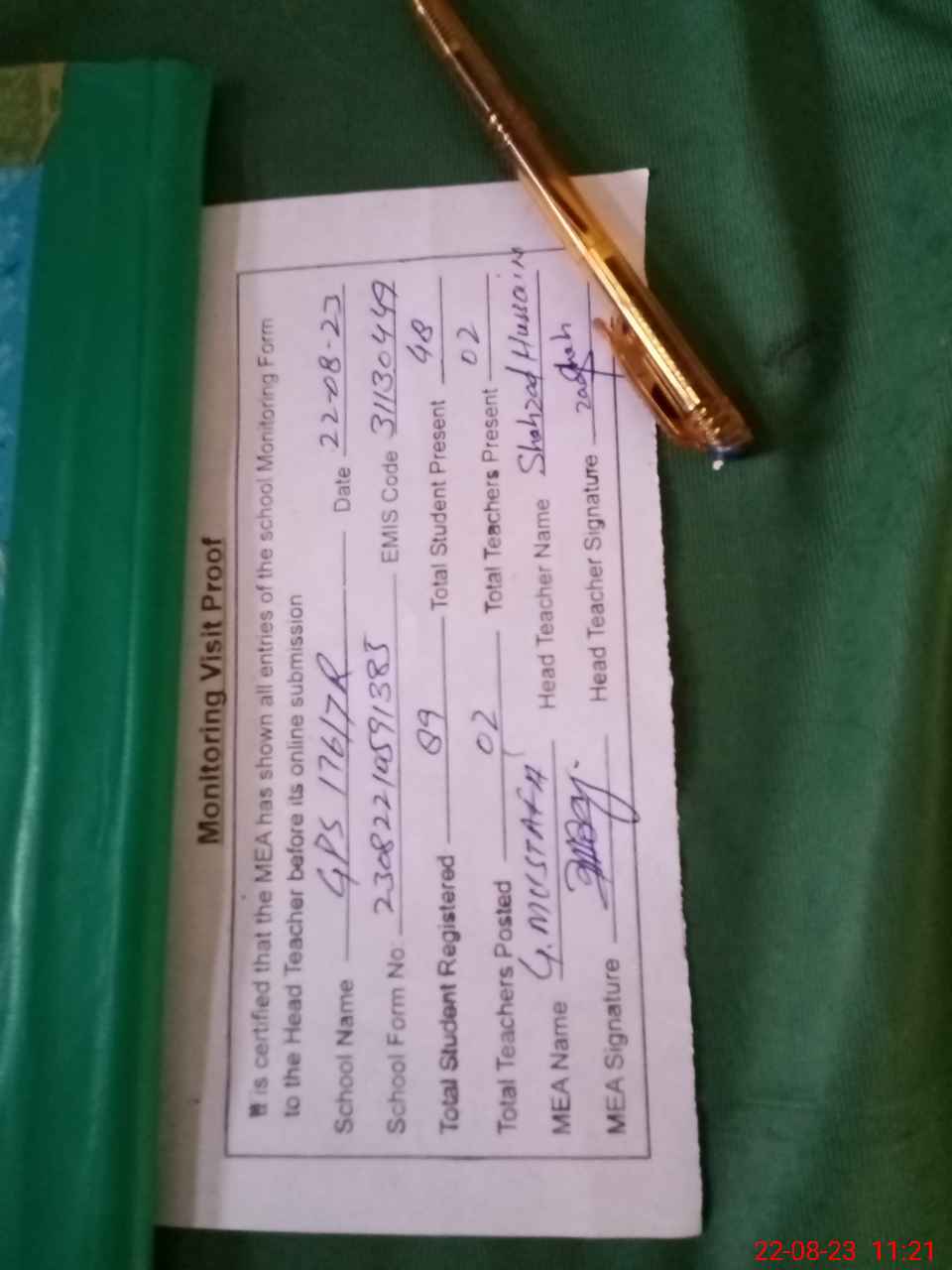 | Attendance Register | Head Teacher | MEA with School | Visit Proof |