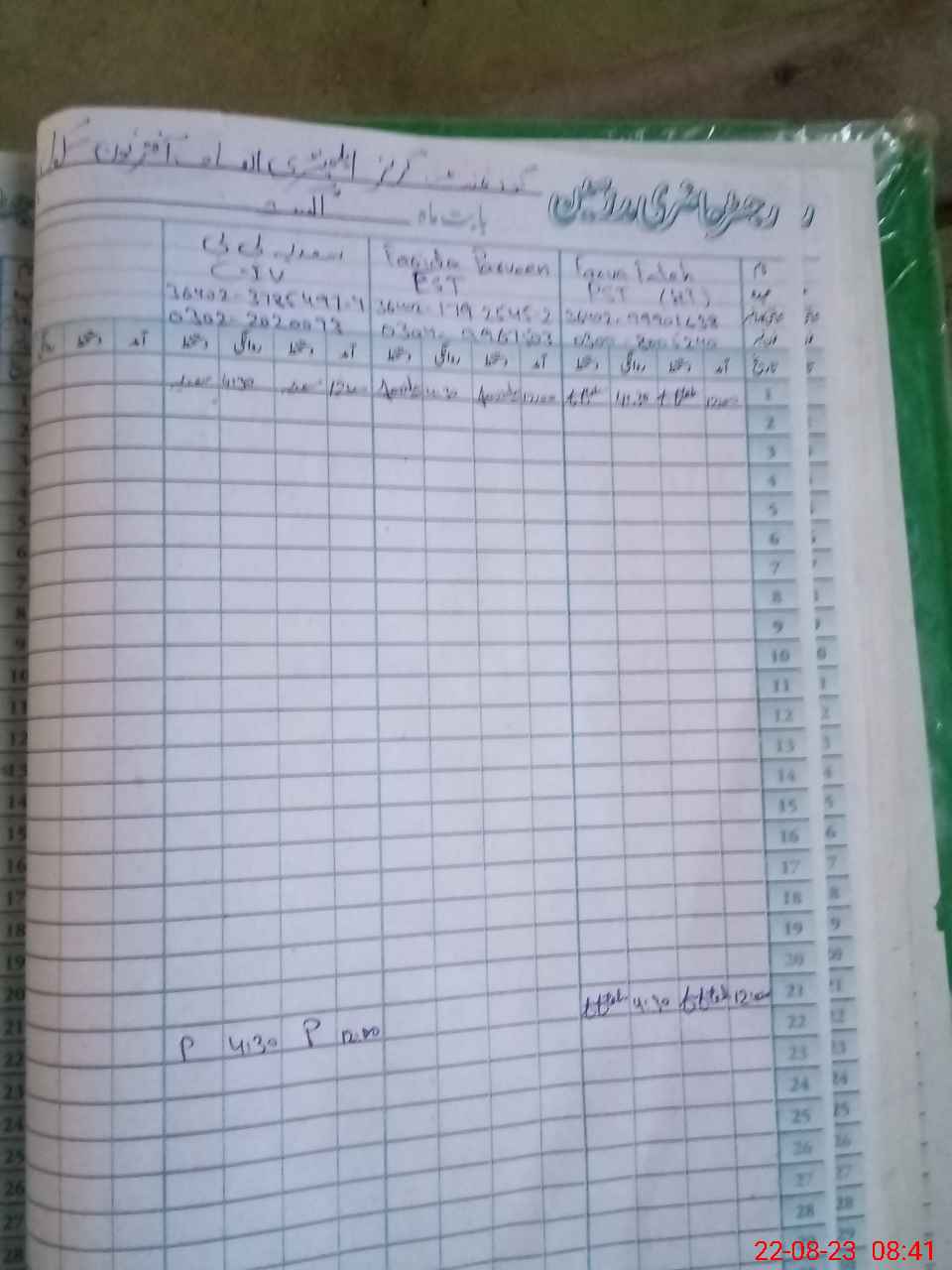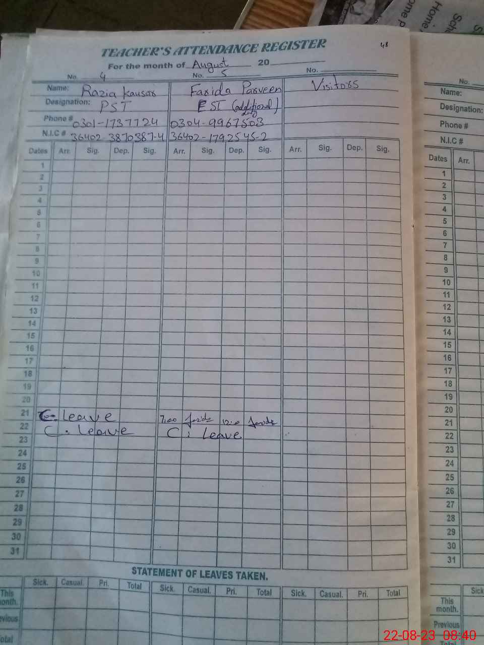 | CNIC | Full Name | Designation | R/C | Absence During Last Calender Month |