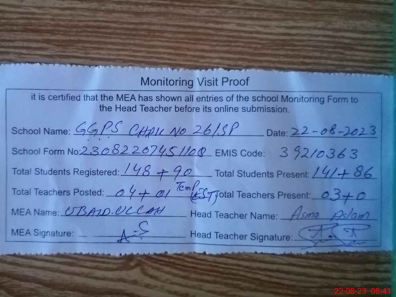| Attendance Register | Head Teacher | MEA with School | Visit Proof |