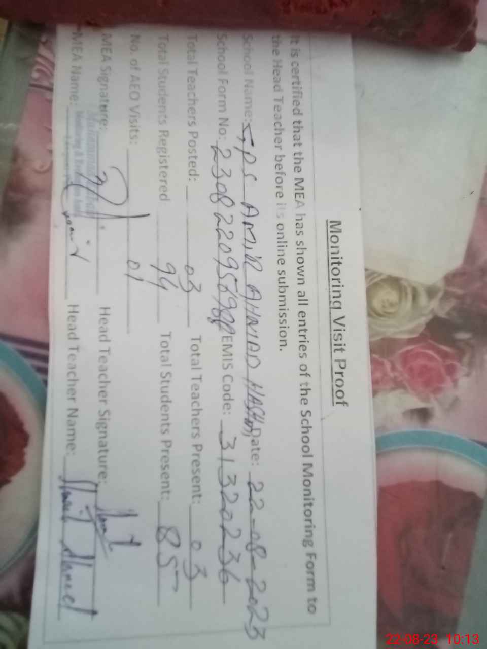 | Name: SH**** AH**** Designation: (School Headmaster's/Headmistress's) PST Phone/Cell Number: 03**** |
