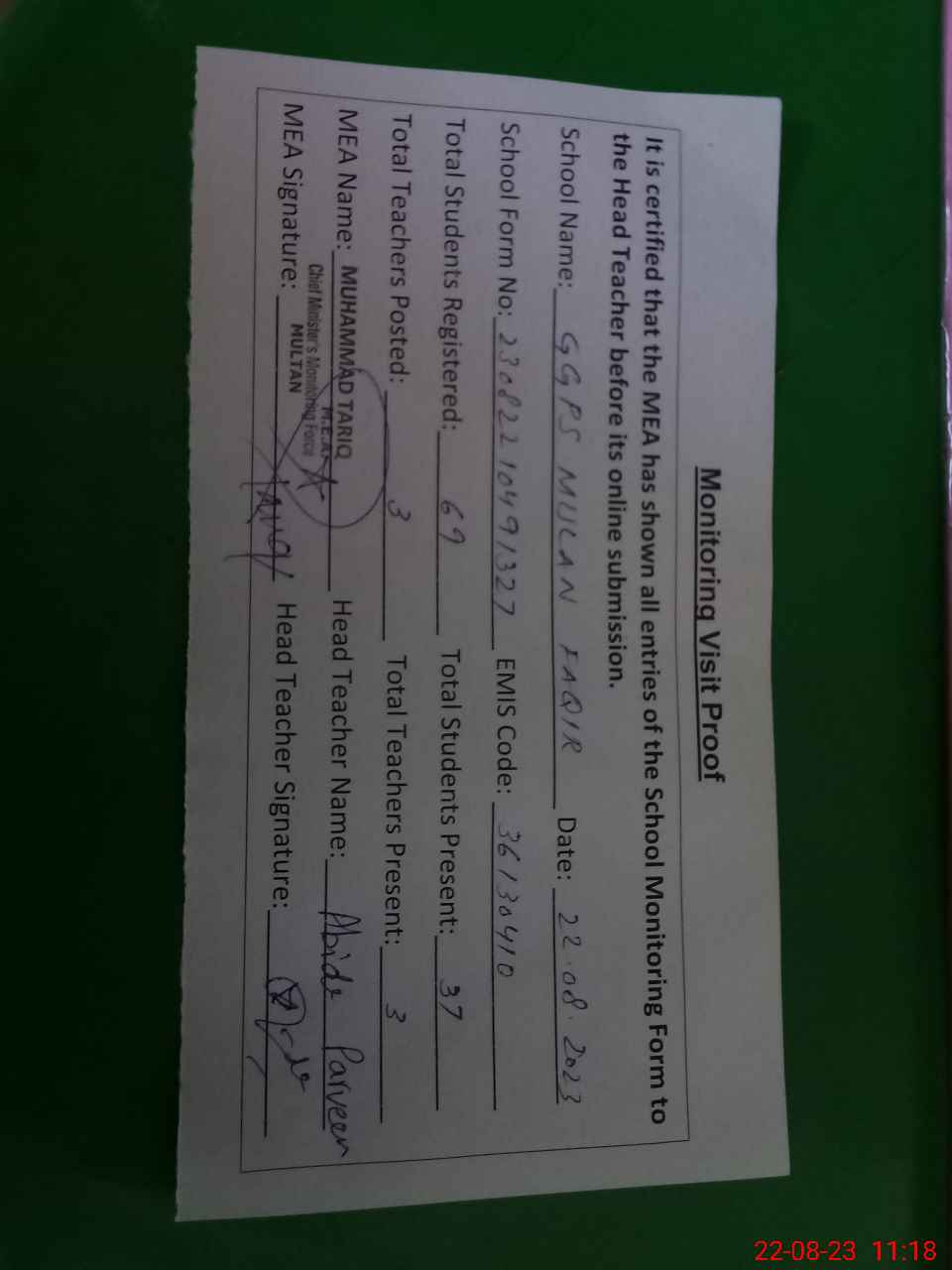 | EMIS Code: 36130410 | Name of School: GGPS MULAN FAQIR MULTAN | |||