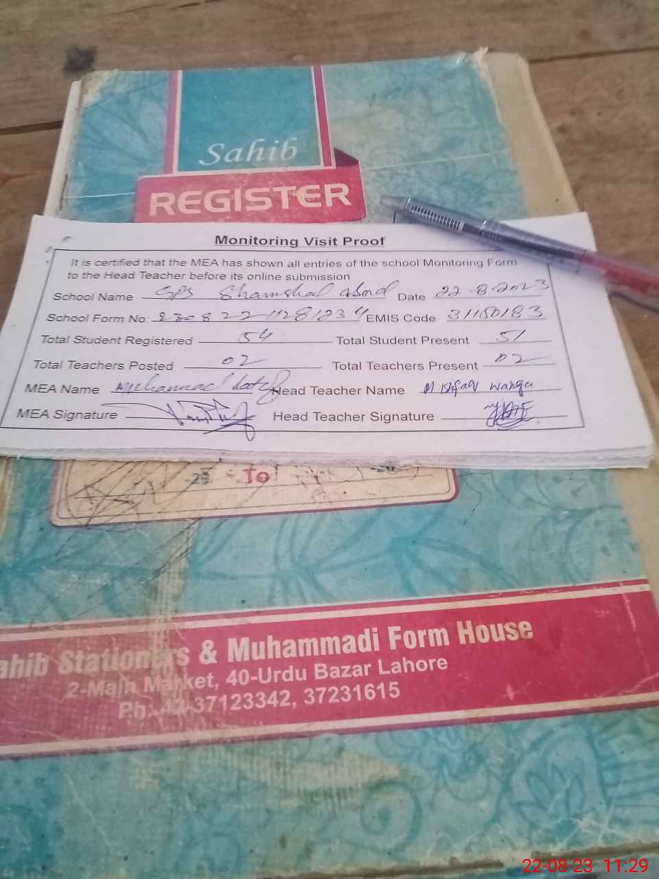| Attendance Register | Head Teacher | MEA with School | Visit Proof |