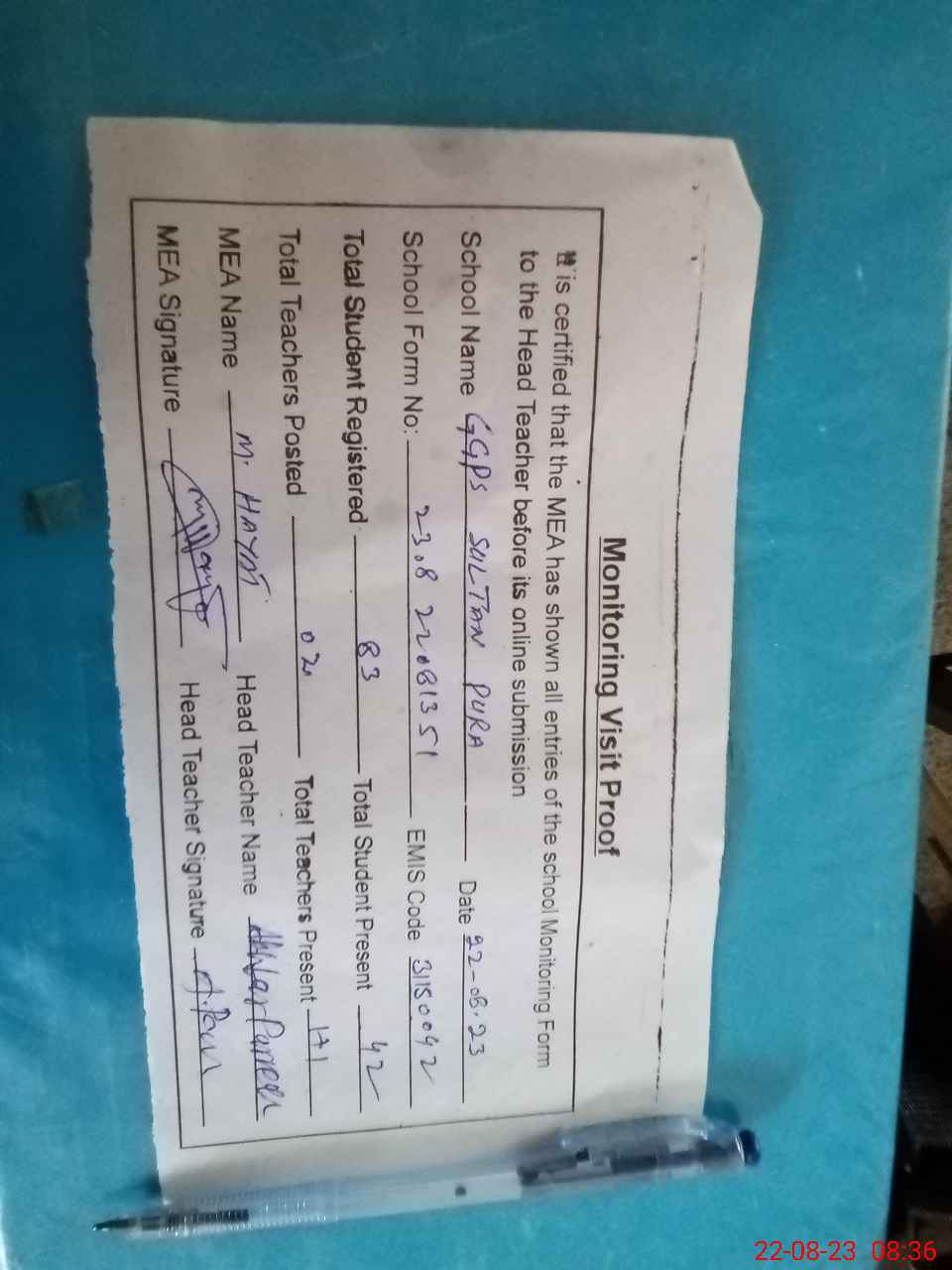 | Attendance Register | Head Teacher | MEA with School | Visit Proof |