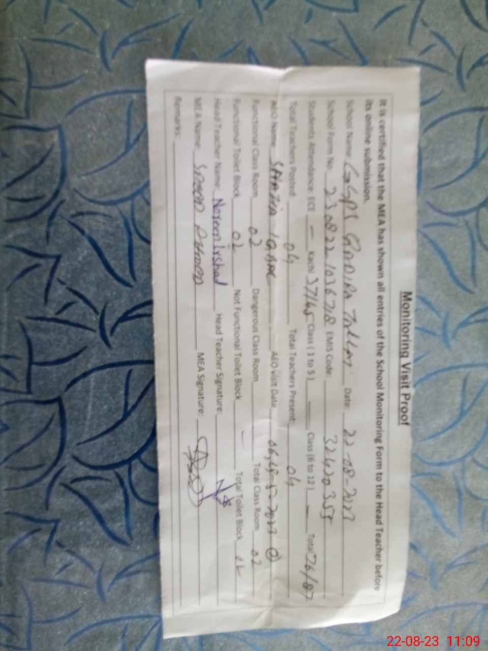 | Attendance Register | Head Teacher | MEA with School | Visit Proof |