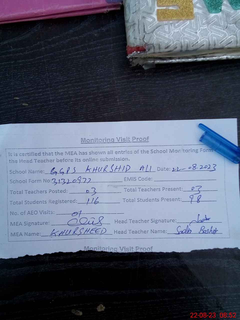 | Attendance Register | Head Teacher | MEA with School | Visit Proof |