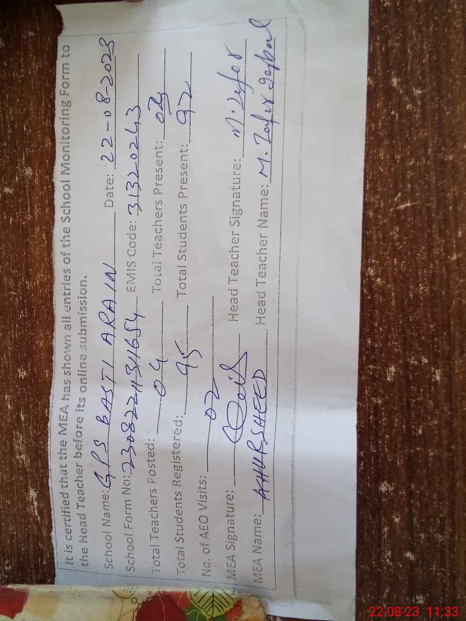 | EMIS Code: 31320243 | Name of School: GPS BASTI ARAIN | |||