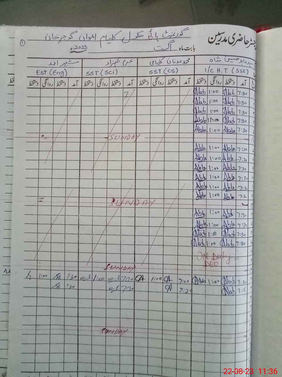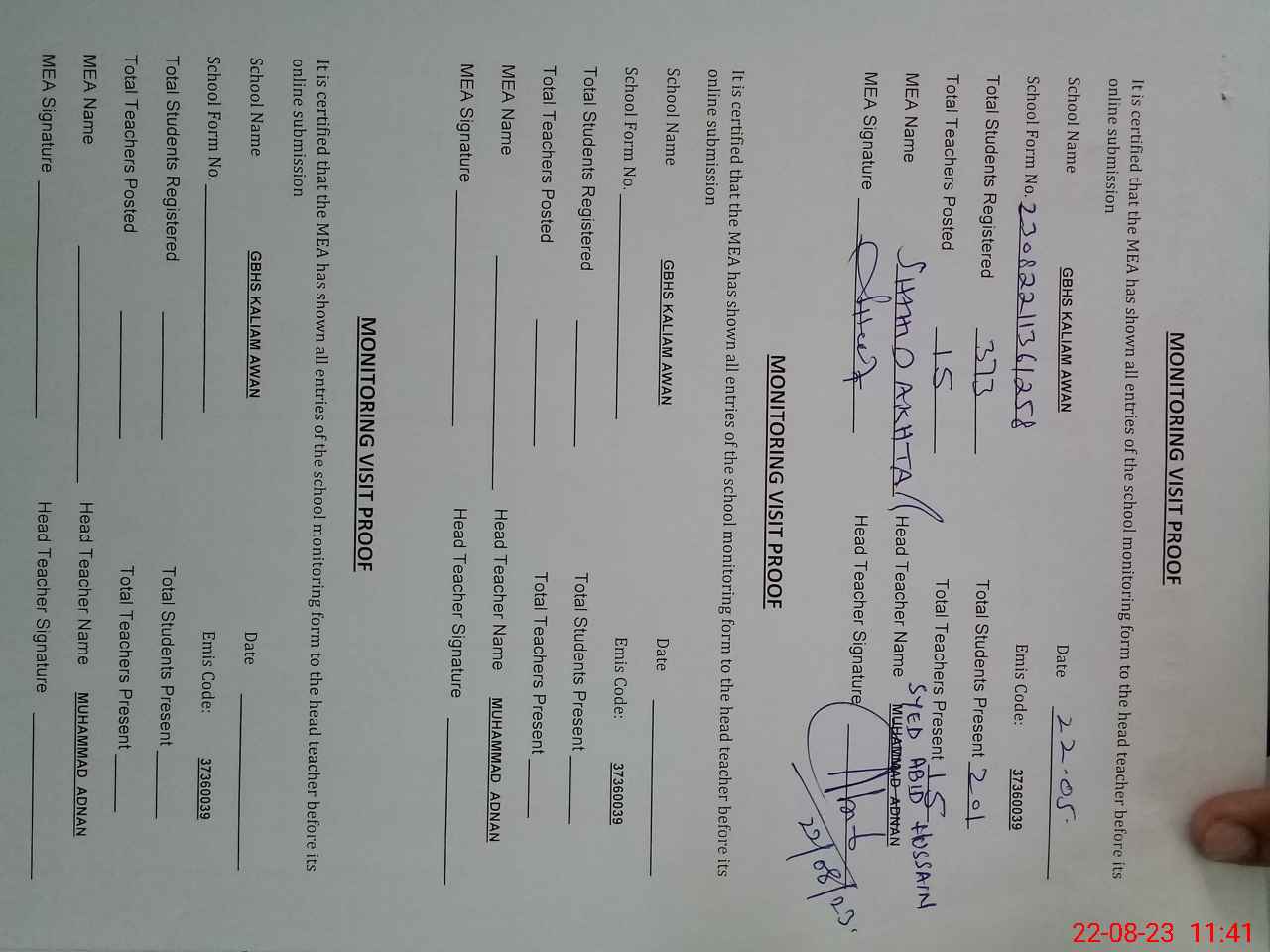 | Remarks (Use Separate Page if Required): Head teacher Syed abid Hussain Shah not on sis but present in school | |||||