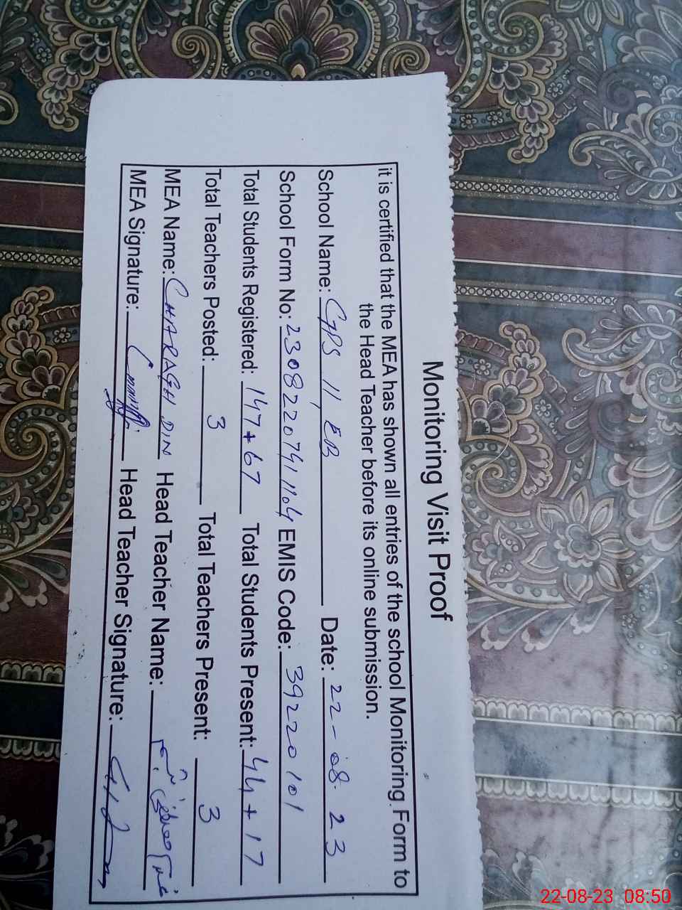 | Attendance Register | Head Teacher | MEA with School | Visit Proof |
