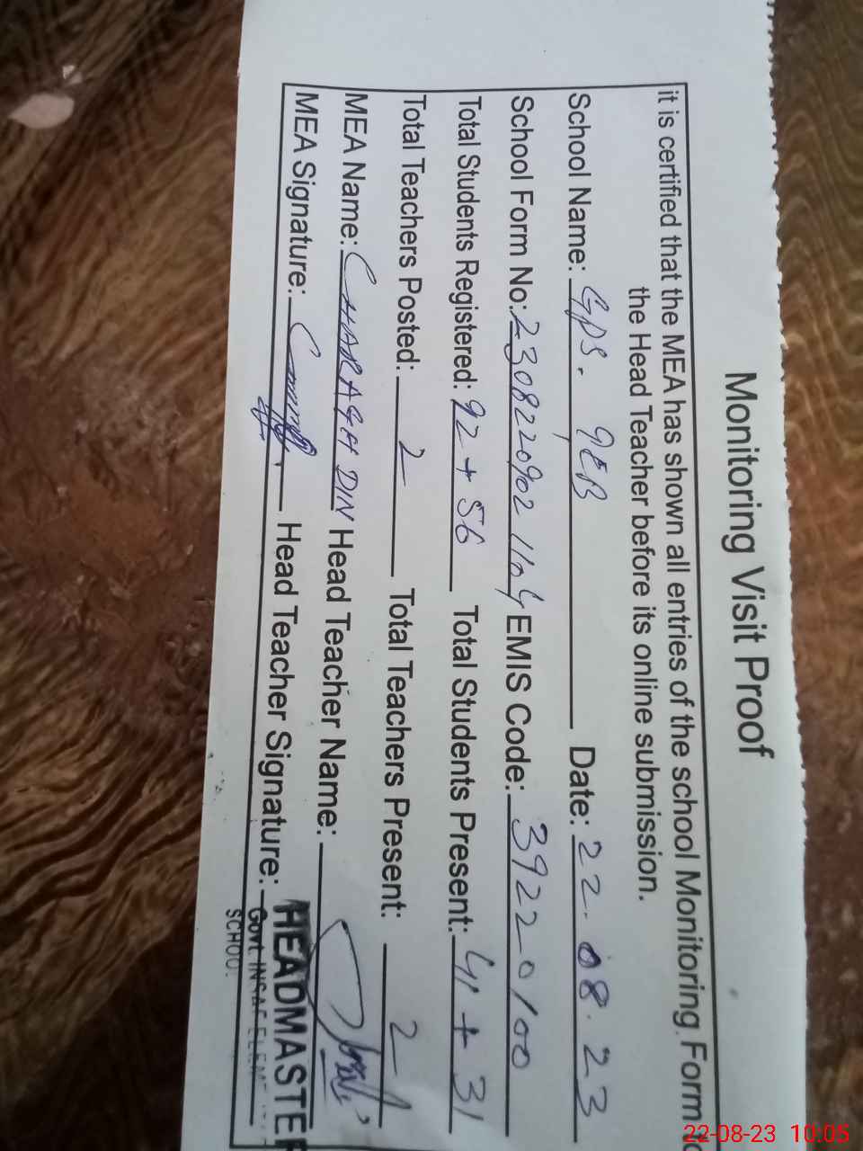 | Attendance Register | Head Teacher | MEA with School | Visit Proof |