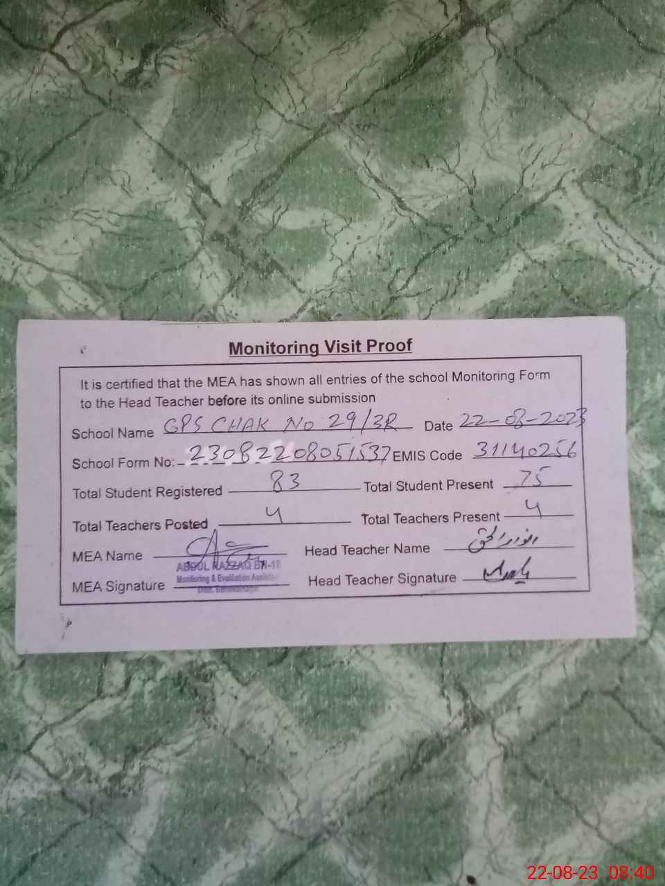 | Attendance Register | Head Teacher | MEA with School | Visit Proof |