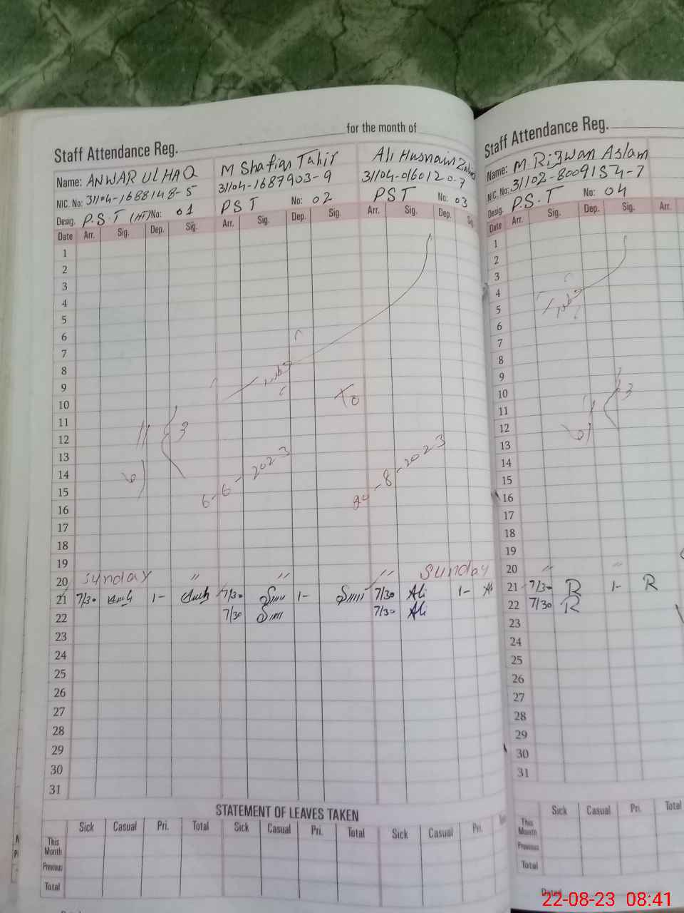 | CNIC | Full Name | Designation | R/C | Absence During Last Calender Month |