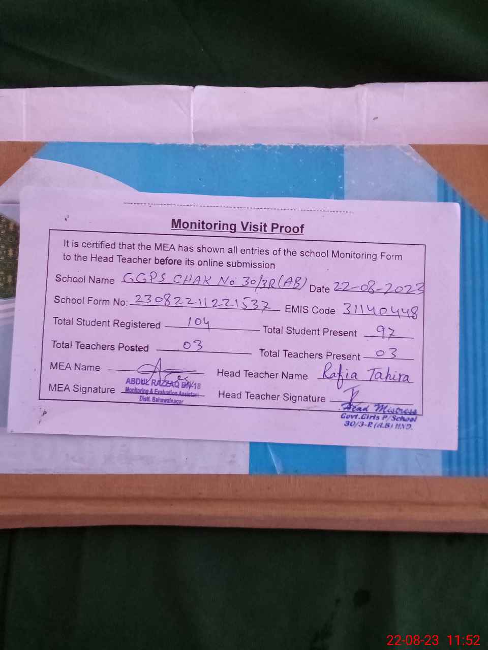 | Attendance Register | Head Teacher | MEA with School | Visit Proof |