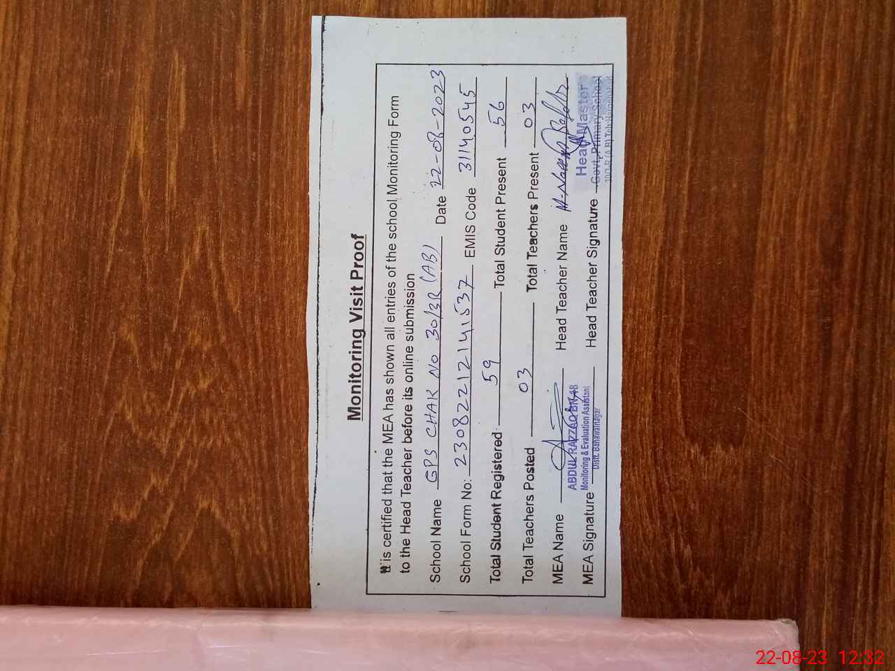 | Attendance Register | Head Teacher | MEA with School | Visit Proof |